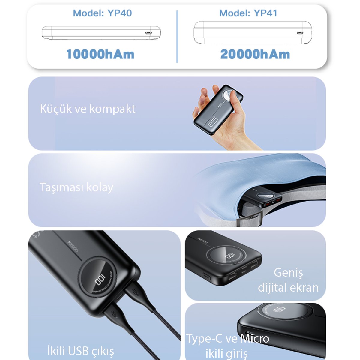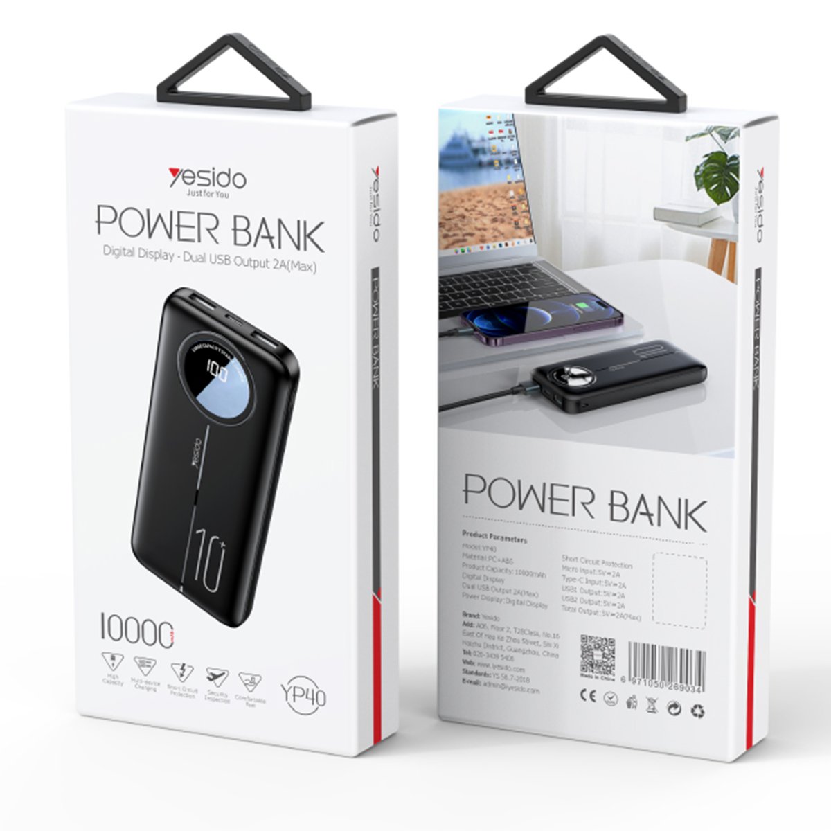 Yesido YP40 10.000 mAh Dijital Göstergeli USB3.0 PD Hızlı Şarj Powerbank